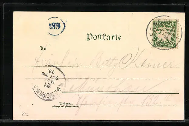 gelaufen 1899, vorderseitig Klebe- und Papierreste, guter Zustand