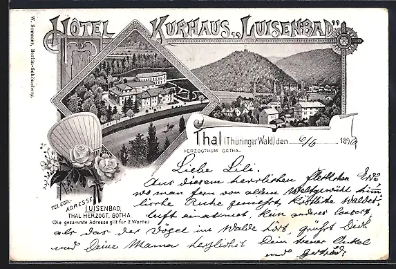 Lithographie Thal /Thüringer Wald, Hotel-Kurhaus Luisenbad, Ortsansicht