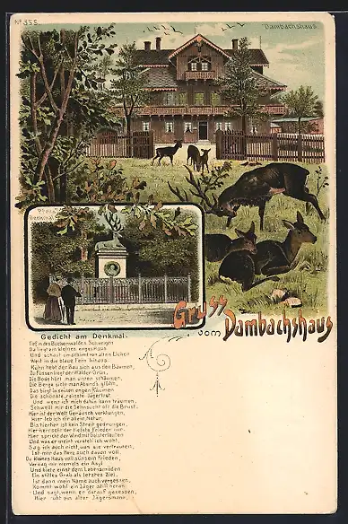 Lithographie Thale, Gasthof Dambachshaus, Pfeil`s Denkmal, Gedicht am Denkmal