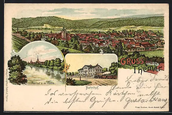 Lithographie Themar, Bahnhof, Partie an der Werra, Gesamtansicht