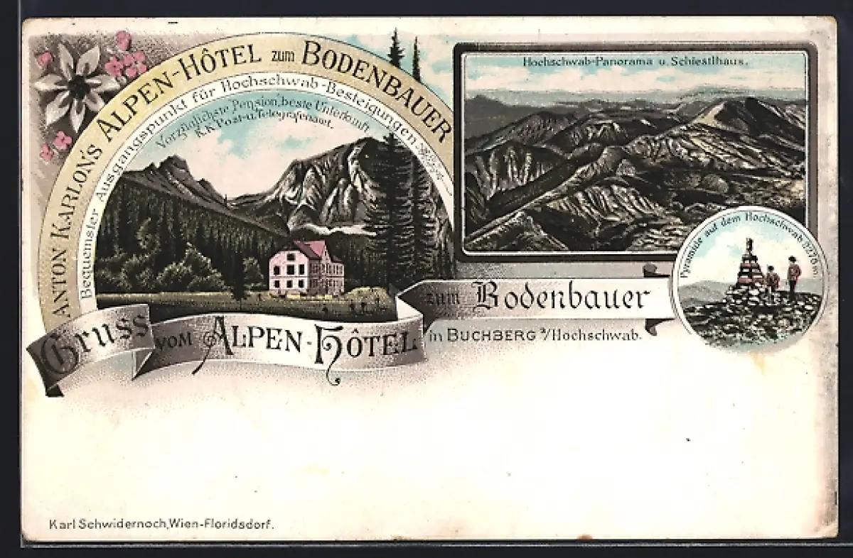 Lithographie Thörl /Stmk., Buchberg, Hotel zum Bodenbauer A. Karlon, Pyramide auf dem Hochschwab, Bergpanorama