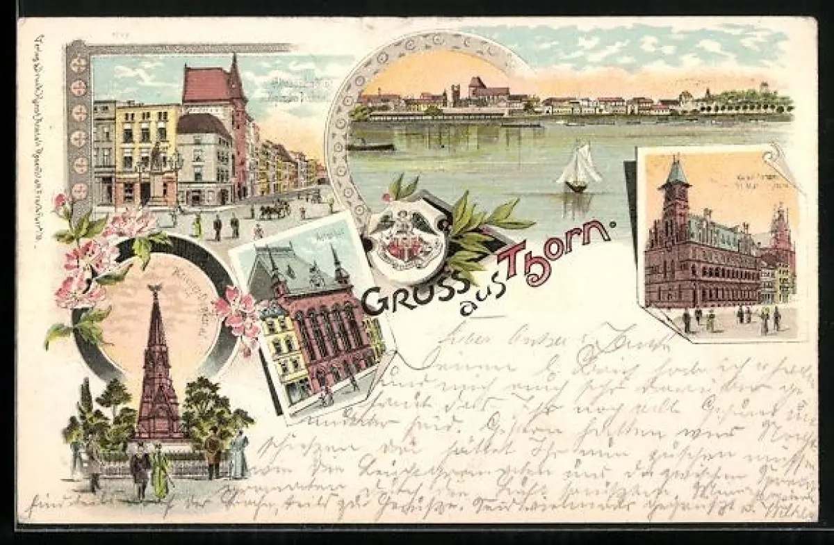 Lithographie Thorn / Torun, Markt mit Kopernikusdenkmal, Kaiserliches Postamt und St. Marien Kirche