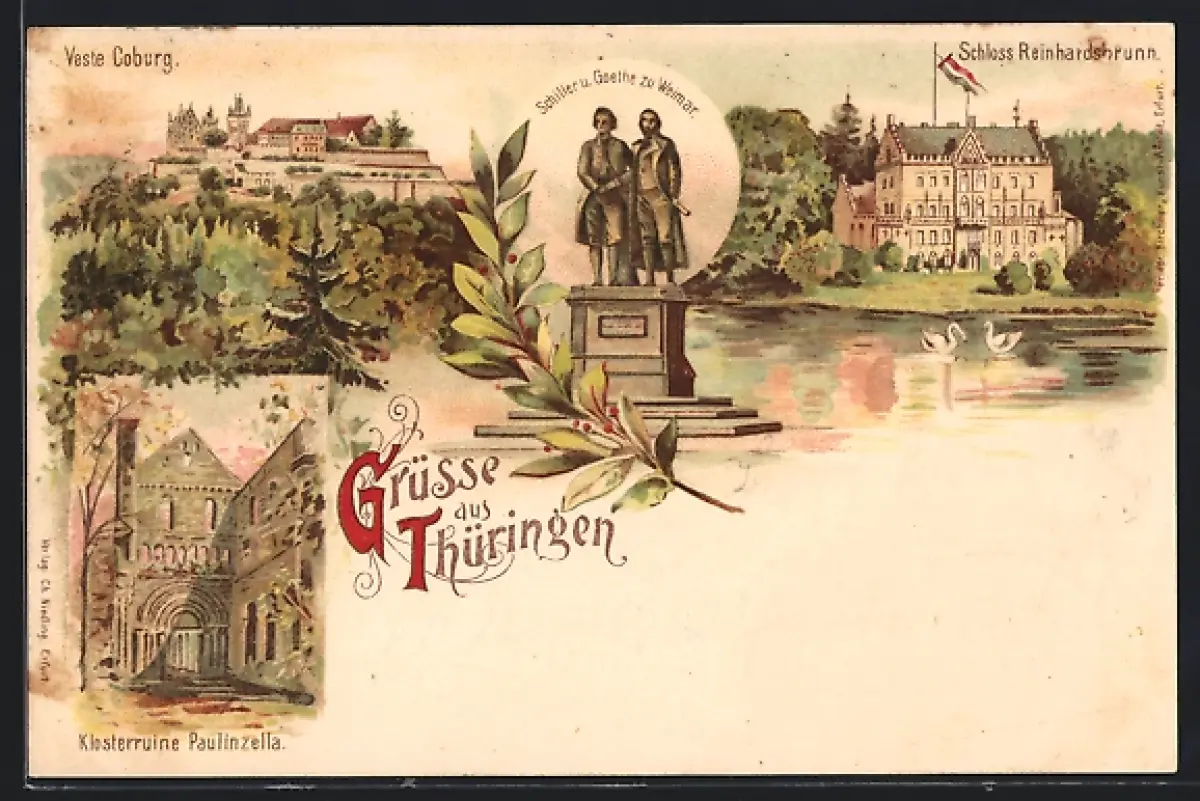 Lithographie Thüringen, Veste Coburg, Schloss Reinhardsbrunn, Klosterruine Paulinzella, Schiller-Goethe-Denkmal