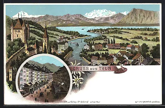 Lithographie Thun, Teilansicht mit Fluss, Strassenansicht mit Ständen