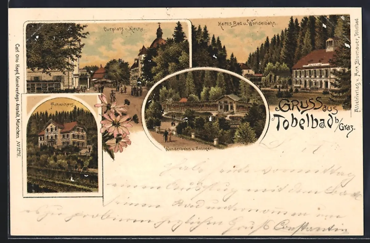 Lithographie Tobelbad, Actienhaus, Curplatz und Kirche, Kaltes Bad und Wandelbahn