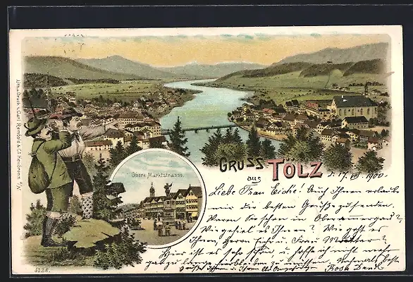 Lithographie Tölz, Totalansicht, Obere Marktstrasse, Jäger