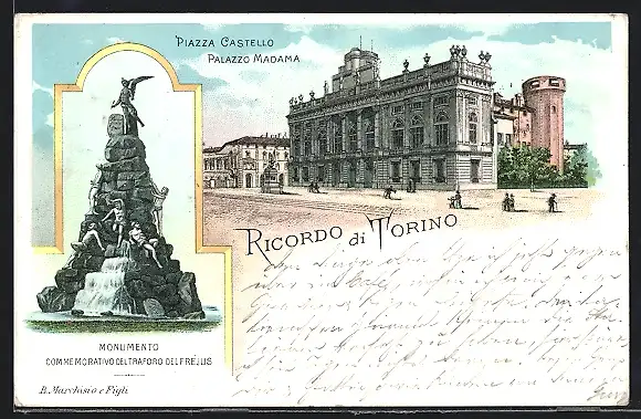 Lithographie Torino, Piazza Castello, Palazzo Madama, Monumento Commemorativo del Traforo del Fréjus
