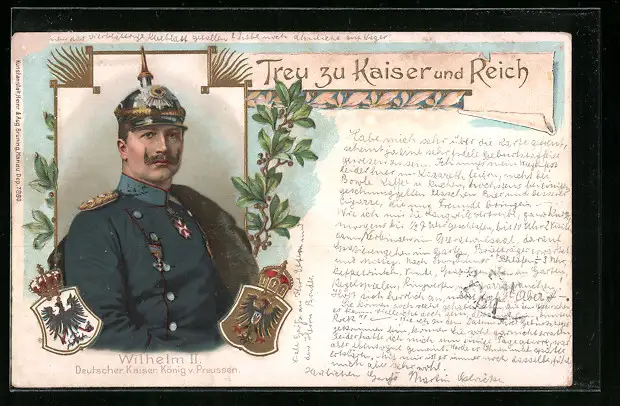 Lithographie Treu zu Kaiser und Reich, Kaiser Wilhelm II. in Uniform