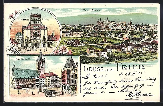 Lithographie Trier, Totalansicht, Mathias-Kirche, Hauptmarkt