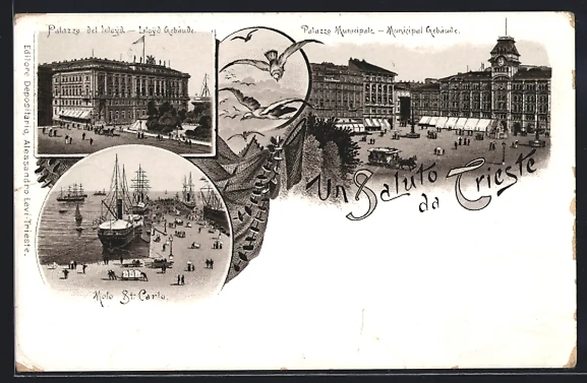 Lithographie Trieste, Lloyd-Gebäude, Municipal-Gebäude, Molo St. Carlo