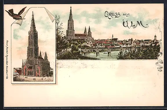 Lithographie Ulm / Donau, Blick auf das Münster, Ortsansicht