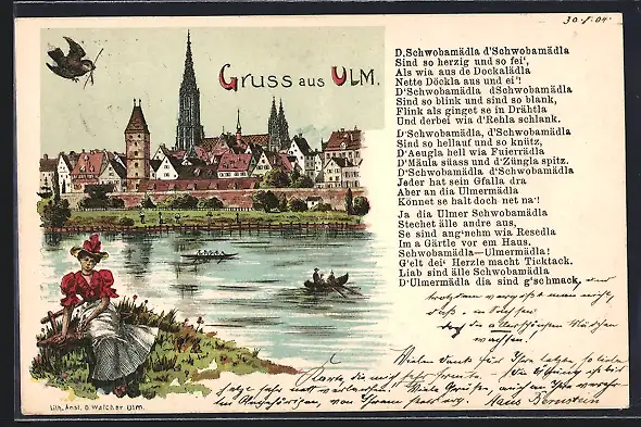 Lithographie Ulm / Donau, Panoramablick auf die Stadt, Ulmerin an der Donau