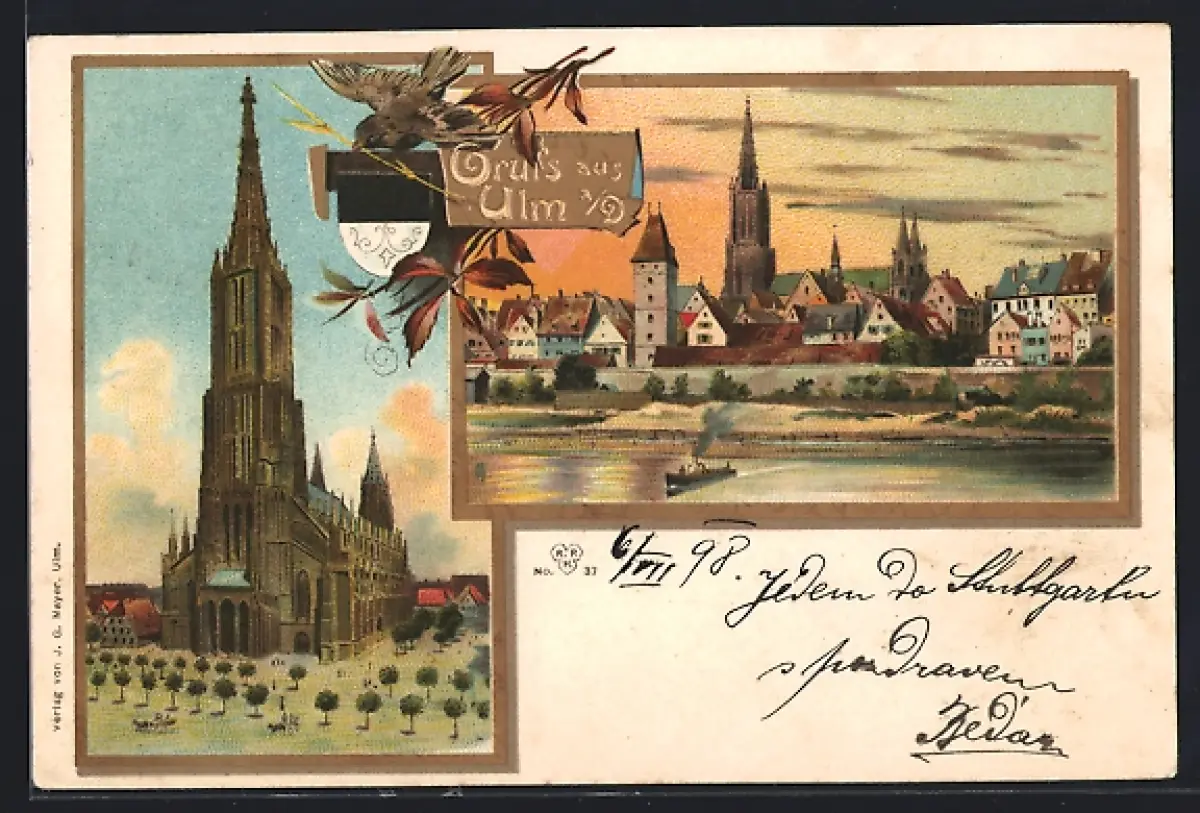 Lithographie Ulm / Donau, Teilansicht, Münster