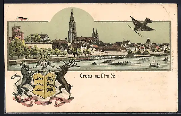 Lithographie Ulm / Donau, Totalansicht mit Münster