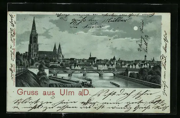Lithographie Ulm a. D., Ortsansicht mit Flussbrücke