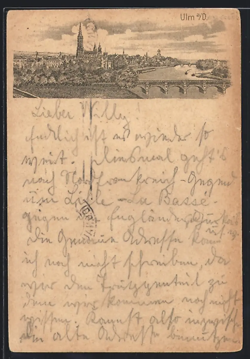 Lithographie Ulm an der Donau, Donaupartie mit Brücke
