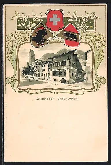Lithographie Unterseen /Interlaken, Wohnhäuser und Kirche, Stadtwappen
