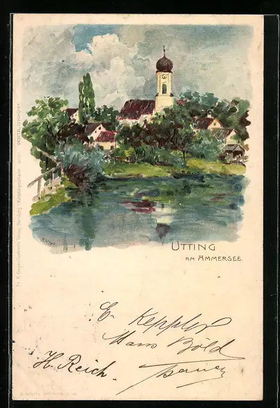 Lithographie Utting /Ammersee, Uferpartie mit Kirche