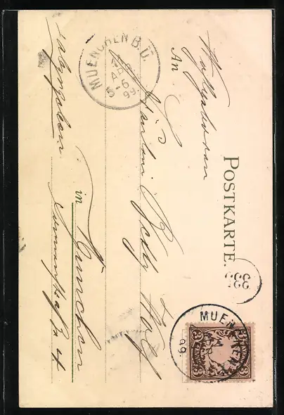 Personenbezogene Daten auf der Rückseite der Karte wurden durch blauen Textmarker unkenntlich gemacht. Die blauen Stellen sind auf die Vorderseite durchgeweicht und wirken sich negativ auf das Postkartenfoto aus