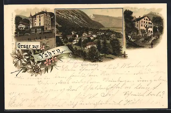Lithographie Vahrn, Hotel Villa May R., Gasthaus Zum Waldsacker, Teilansicht vom Ort