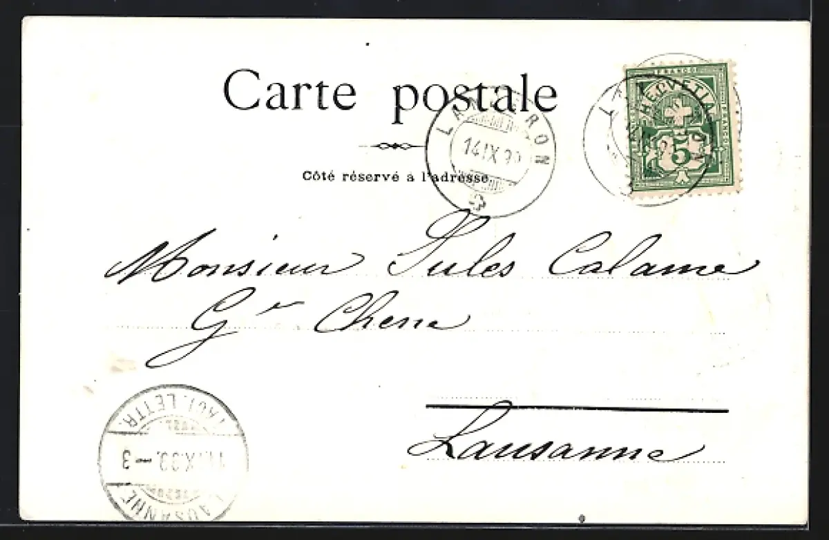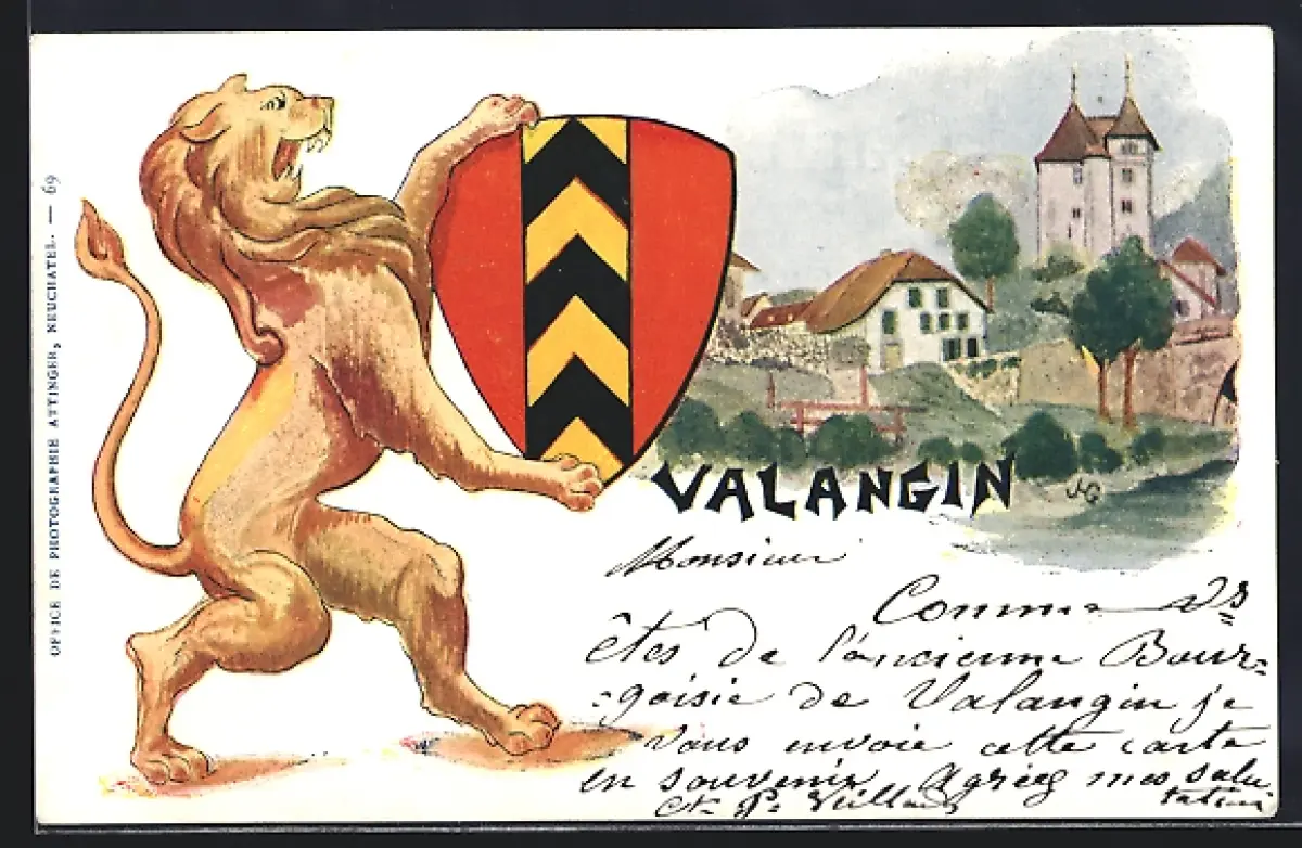 Lithographie Valangin, Ortsansicht, Löwe mit Wappenschild