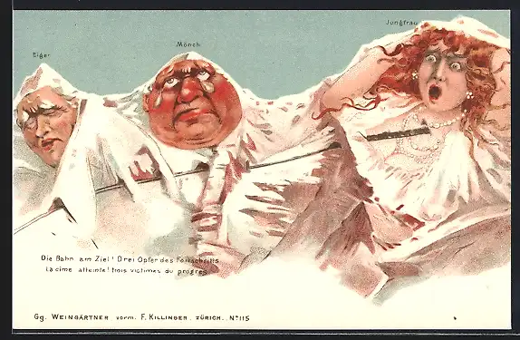 Lithographie Vermenschlichte Berge, Weingärtner vorm. Killinger Nr. 115, Eiger, Mönch und Jungfrau, Berggesichter