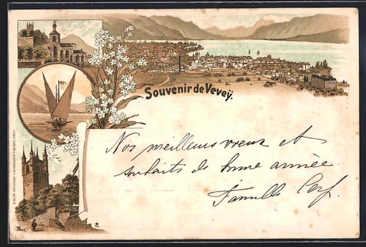 Lithographie Vevey, Kirche, Turm, Segelboot