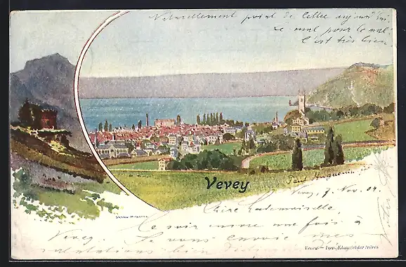 Lithographie Vevey, Ortschaft gegen das Ufer