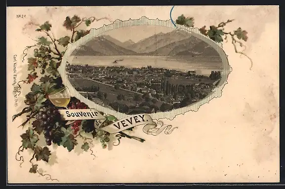 Lithographie Vevey, Teilansicht, Weinglas- und Trauben, Passepartout