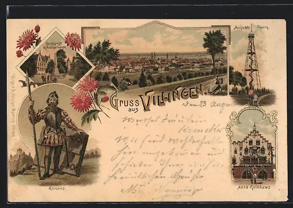 Lithographie Villingen, Reichspost, Romäus, Altes Rathaus u. Aussichtsturm