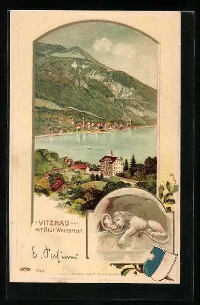 Lithographie Vitznau, Ortsansicht mit Rigi-Weissfluh, Löwendenkmal