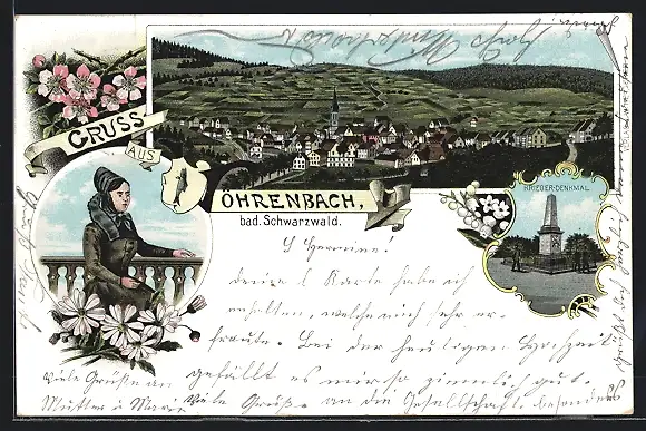 Lithographie Vöhrenbach /bad. Schwarzwald, Krieger-Denkmal, Ortsansicht, Schwarzwälderin in Tracht
