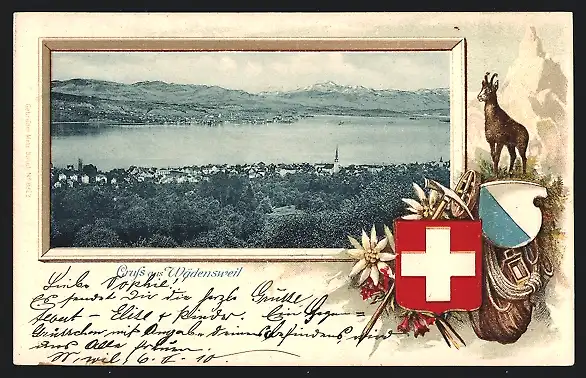Lithographie Wädensweil, Panoramablick in die Berge, Passepartout mit Wappen und Gämse
