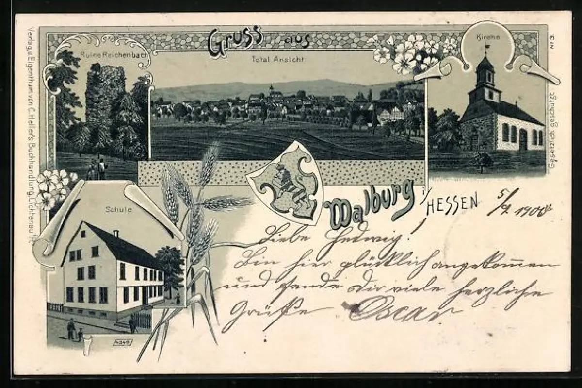 Lithographie Walburg i. Hessen, Kirche, Schule, Ruine Reichenbach