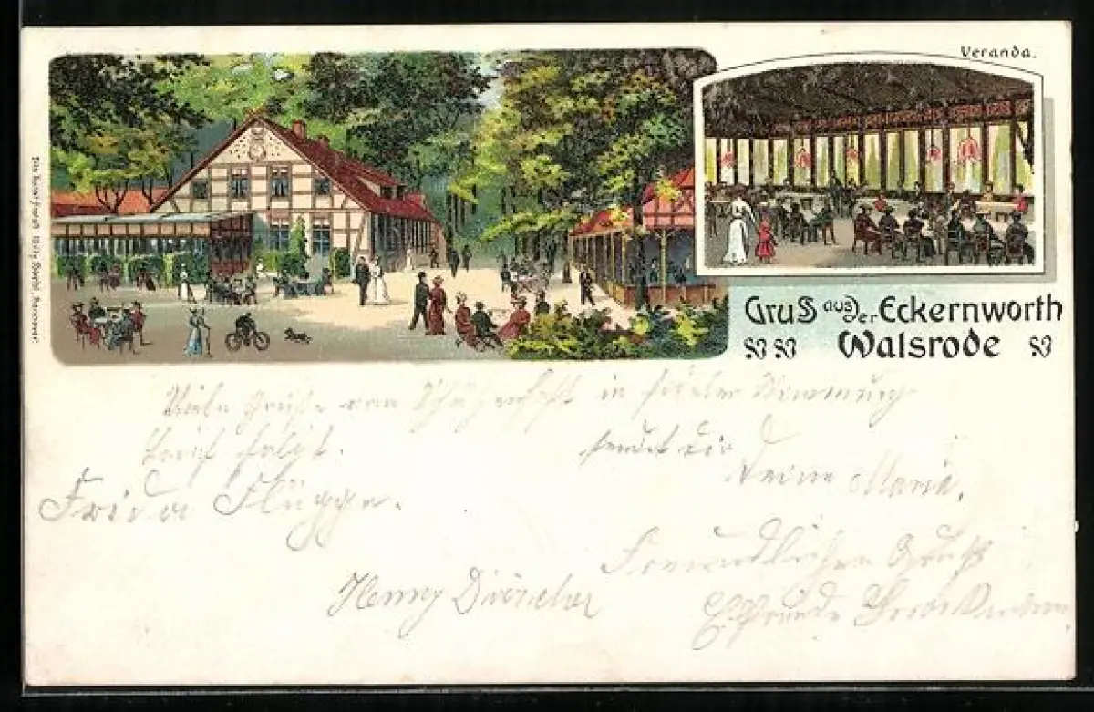 Lithographie Walsrode, Gasthof Eckernworth mit Veranda