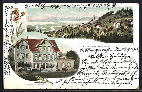 Lithographie Walzenhausen, Teilansicht, Gasthaus-Pension z. Linde