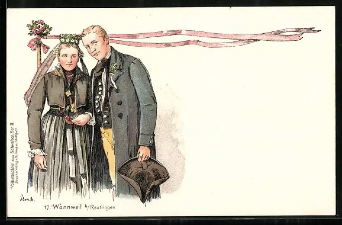 Lithographie Wannweil, hübsches Paar in schwäbischer Tracht