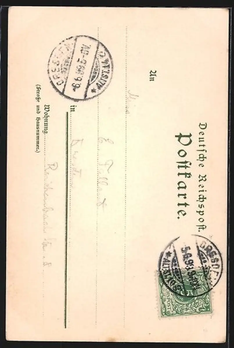 Personenbezogene Daten auf der Rückseite der Karte wurden durch blauen Textmarker unkenntlich gemacht. Die blauen Stellen sind auf die Vorderseite durchgeweicht und wirken sich negativ auf das Postkartenfoto aus