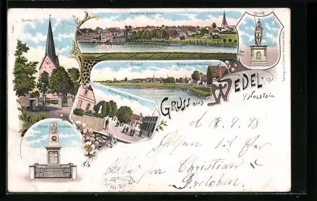 Lithographie Wedel i. Holst., Totalansicht, Kirche, Bahnhof, Roland