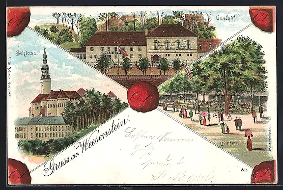 Lithographie Weesenstein, Gasthaus Oscar Senf, Schloss und Garten