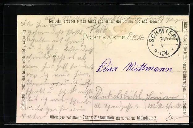 Personenbezogene Daten auf der Rückseite der Karte wurden durch blauen Textmarker unkenntlich gemacht. Die blauen Stellen sind auf die Vorderseite durchgeweicht und wirken sich negativ auf das Postkartenfoto aus