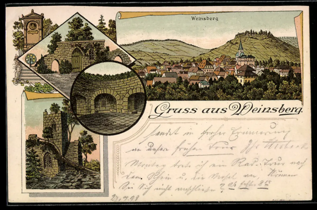 Lithographie Weinsberg, Ortsansicht mit Kirche, Ruine