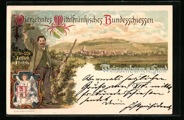 Lithographie Weissenburg a. Sand, Vierzehntes Mittelfränkisches Bundesschiessen, Teilansicht, PP15C15, Ganzsache Bayern