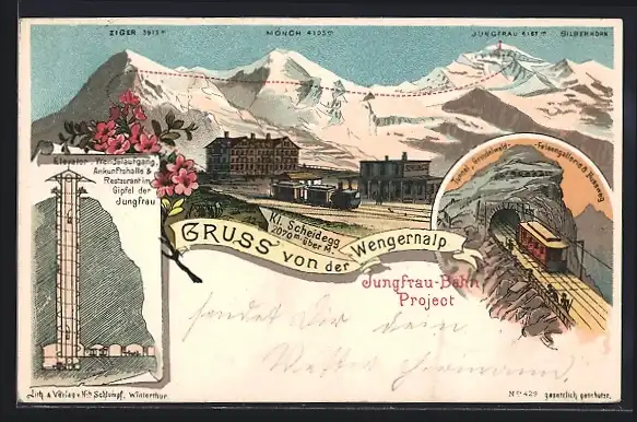 Lithographie Wengernalp, Bergbahn fährt in Tunnel, Elevator & Restaurant im Gipfel der Jungfrau, Eiger