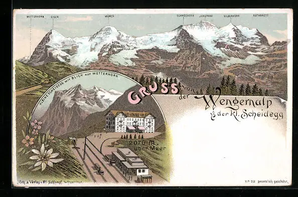 Lithographie Wengernalp, Kleine Scheidegg mit Blick auf Wetterhorn