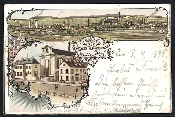 Lithographie Werl, Franziskaner Kloster, Panorama