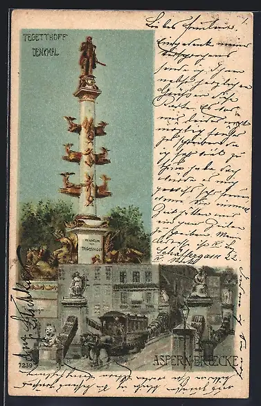 Lithographie Wien, Tegetthoff-Denkmal und Aspern-Brücke