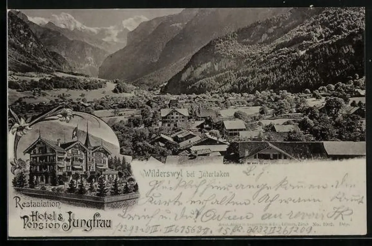 Lithographie Wilderswyl, Hotel-Pension Jungfrau, Totalansicht mit Gebirge