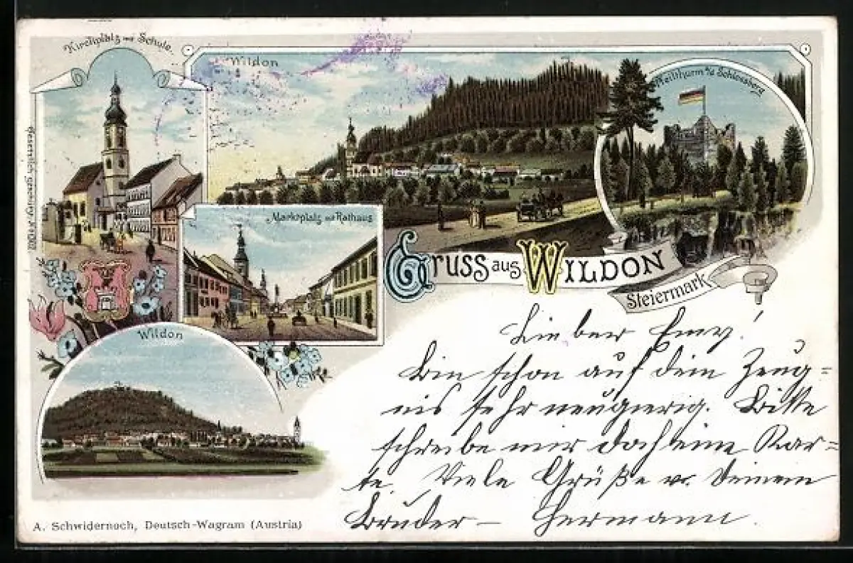 Lithographie Wildon, Pfeilturm a. d. Schlossberg, Kirchplatz mit Schule, Marktplatz mit Rathaus
