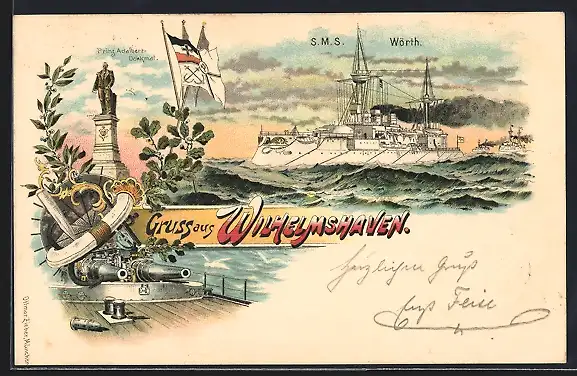 Lithographie Wilhelmshaven, SMS Wörth auf hoher See, Prinz Adalbert-Denkmal